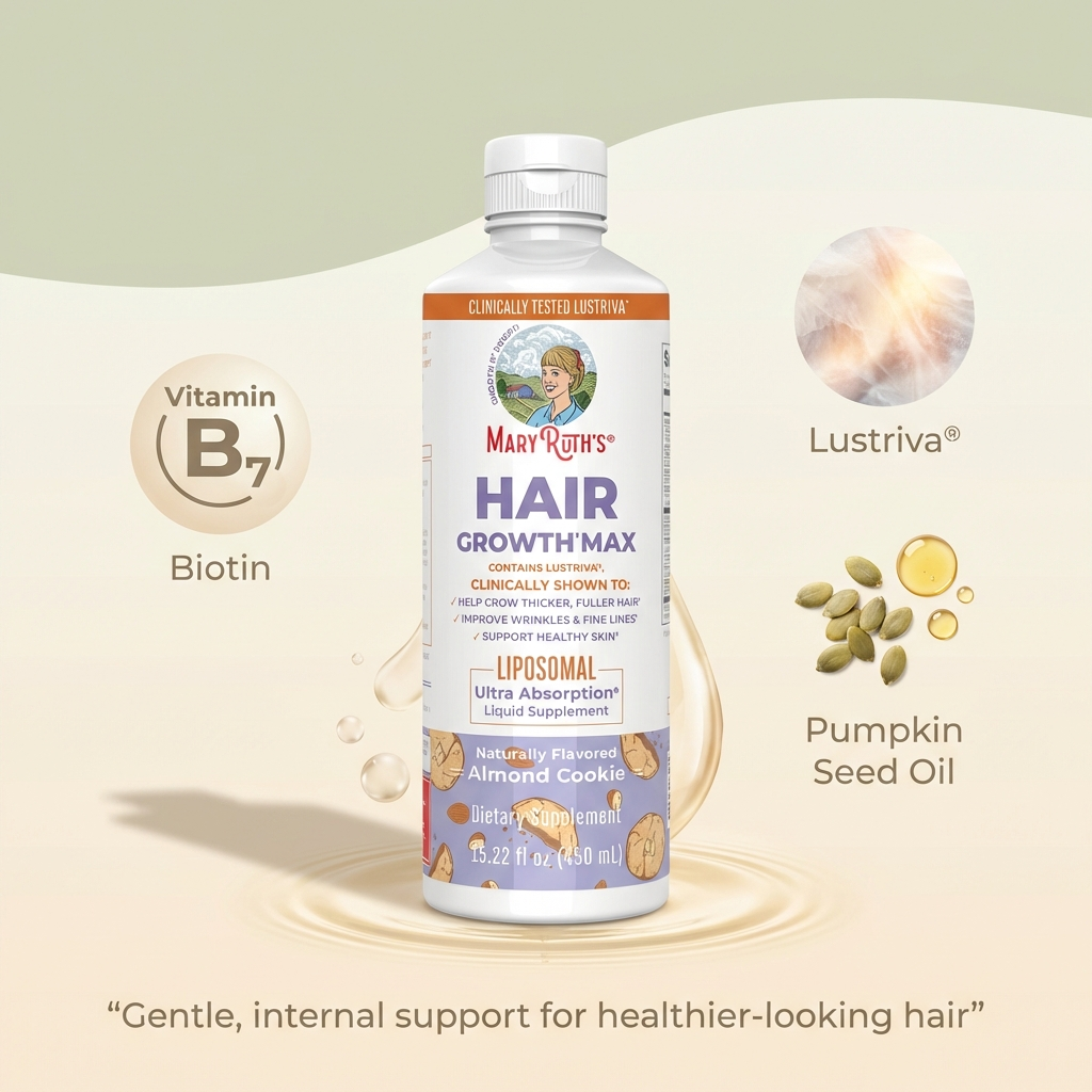 Hair can change over time due to age, hormones, and stress, which can affect how strong, full, and healthy it looks. Nivoro™ Hair Growth Max supports hair health from within using a liquid, liposomal formula designed to make daily use easy and help nutrient absorption. It combines biotin, which contributes to the maintenance of normal hair, Lustriva®, a biotin-silicon complex included to support the appearance of thicker-looking hair and smoother-looking skin, and pumpkin seed oil, a nutrient-rich oil traditionally used to support healthy hair and scalp conditions.